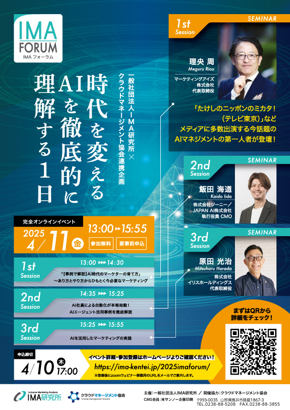 2025年4月11日(金)、サンノー企画印刷が加盟する全国ネットワーク「クラウドマネージメント協会」と「一般社団法人IMA研究所」の連携企画として、オンラインセミナー『IMA FORUM 2025』を開催しました。 テーマは「AI時代を徹底的に理解する1日」。 日々進化するテクノロジーを、いかにして地域のビジネスや日々の活動に「体温」を乗せて活かしていくか。単なる効率化ではない、これからの時代の「伝え方」を考えるプロジェクトが動き出しました。