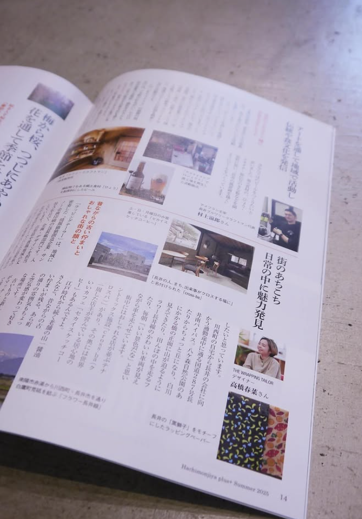 2025年、老舗書店の八文字屋様が発行する会報誌「八文字屋plus+ 010夏号」に、サンノー企画印刷の取り組みをご紹介いただきました。誌面では弊社が展開する包装紙ブランド「THE WRAPPING TAILOR(ラッピングテーラー)」の紹介とともに、制作に込めた想いをデザイナーの髙橋がお話ししています。